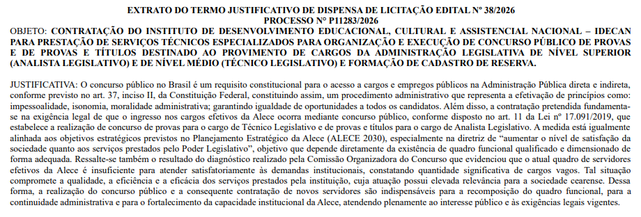 A Assembleia Legislativa do Estado do Ceará definiu nesta quinta-feira (30/4) a banca organizadora do novo concurso. A contratação do Instituto de Desenvolvimento Educacional, Cultural e Assistencial Nacional (Idecan) foi formalizada por dispensa de licitação.
