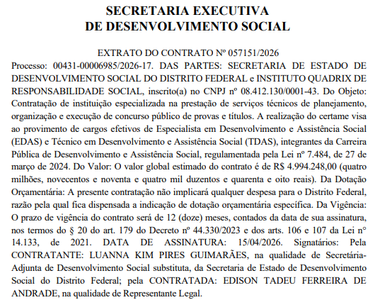 A Secretaria de Desenvolvimento Social do Distrito Federal (Sedes DF) divulgou o extrato de contrato com a banca organizadora Instituto Quadrix nesta sexta-feira (17/4). A próxima etapa do certame é a publicação do edital de abertura!