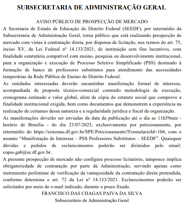 17 de julho de 2025: aviso público de prospecção de mercado