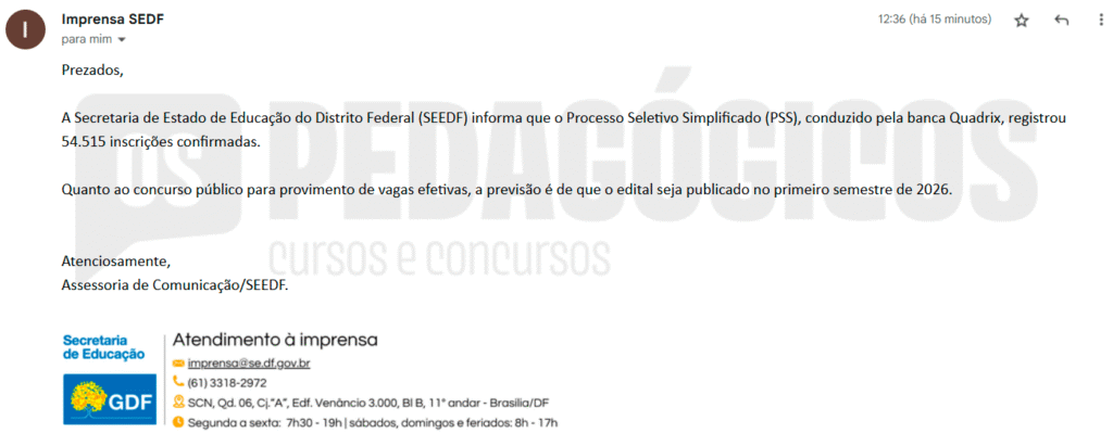 22 de outubro de 2024: a equipe dos Pedagógicos entrou em contato com a SEDF para obter informações sobre o processo seletivo e recebeu a informação de que o concurso SEDF Temporários estava na fase de autorização orçamentária.